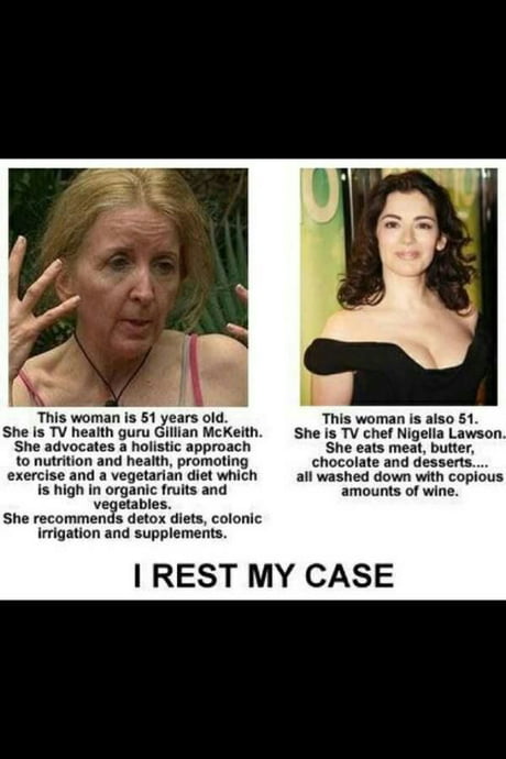 Heat the oil in a medium sized pan and add the onion and a pinch of salt. She recommends detox diets, colonic irrigation and supplements. This is a vegan in her 50's with a medical condition in which a persons spine is curved from side to side in an s or c shape. She looks at least ten years older. Gillian mckeith (age 51) and nigella lawson (6 months off 51) (gillian mc keith vs a meat and milk munching nigella lawson) seriously, come on! Place onions, garlic, carrots and celery in a large saucepan. I think gillian must be lying abuout her age. Amazing how both of their lifestyles have their pros and cons. Now the advertising standards authority has stepped in. She is nigella lawson a tv cook, who eats meat, butter and desserts. Both ladies are in the same age. Gillian mckeith & nigella lawson graphic a popular graphic circulating around the web shows pictures of gillian mckeith and nigella lawson side by side.
